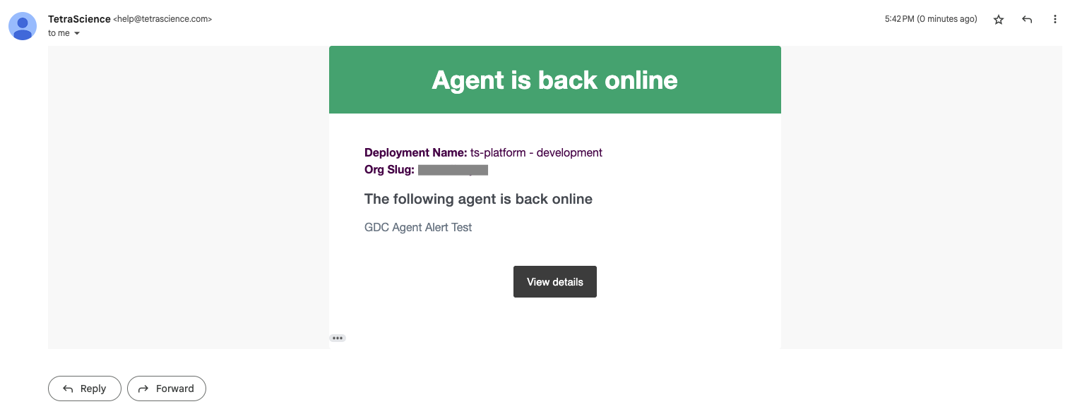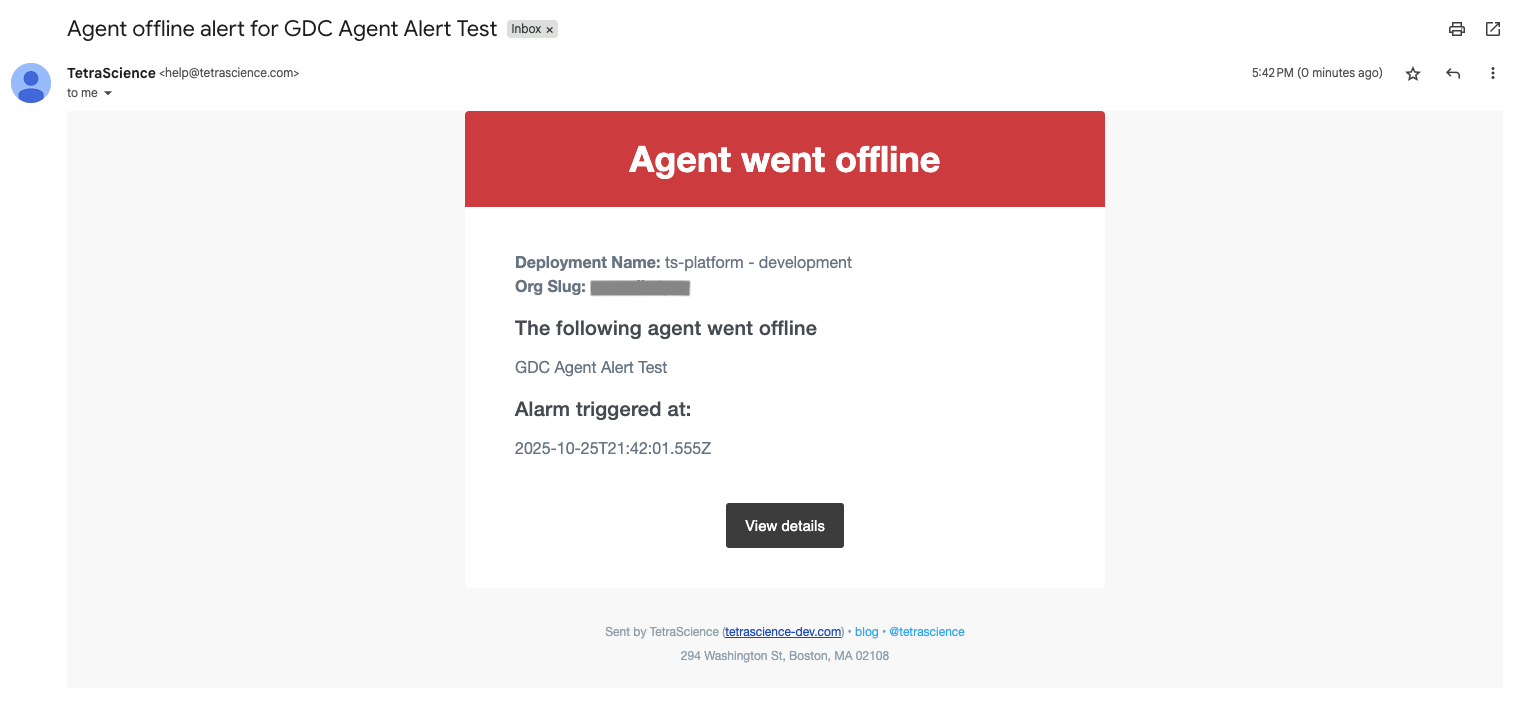 When an alert is triggered, it sends an email to each configured subscriber. The email contains details for the affected TDP deployment, organization, and integration as well as when the alert was triggered. A View details button provides a link to the affected integration's Details page in the TDP user interface.