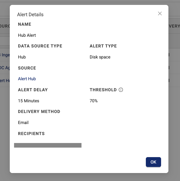 - Select View Details. The Alert Details dialog displays the alert's configuration details.