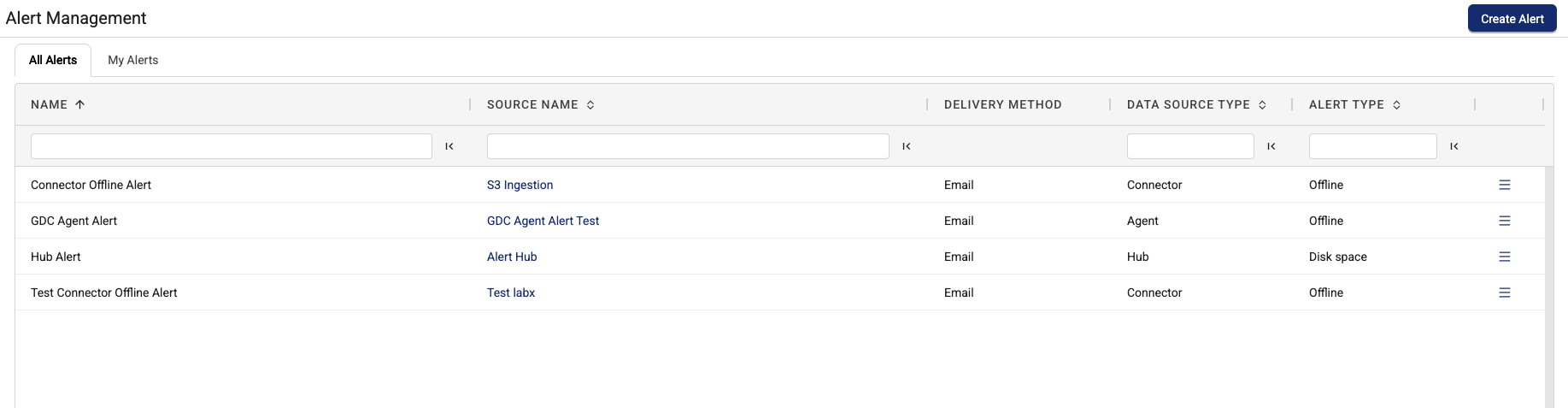 The Alert Management page currently supports alerts for Tetra Agents, Tetra Connectors, and Tetra Hubs. Each integration type supports different alerts based on its specific monitoring needs.