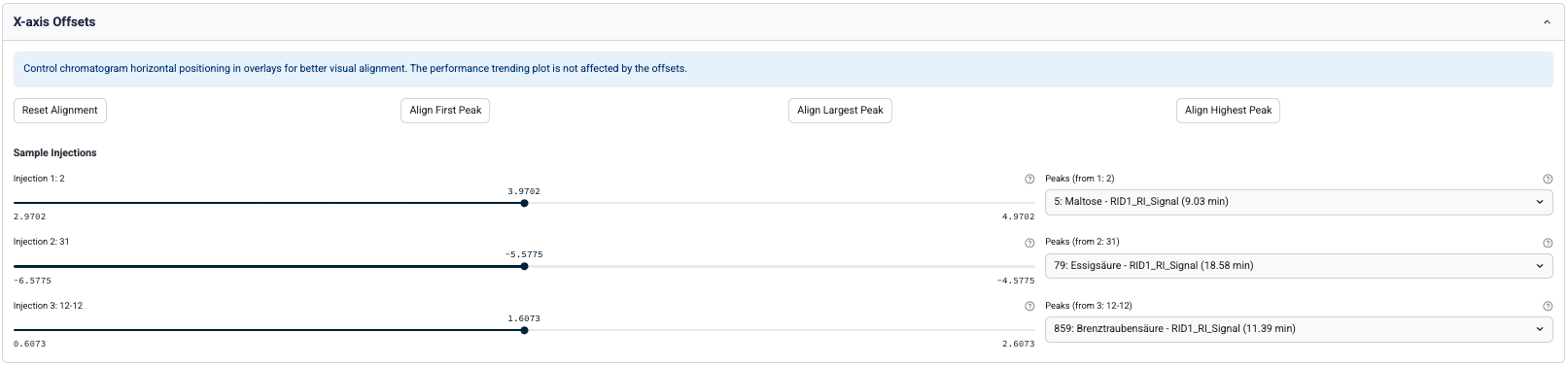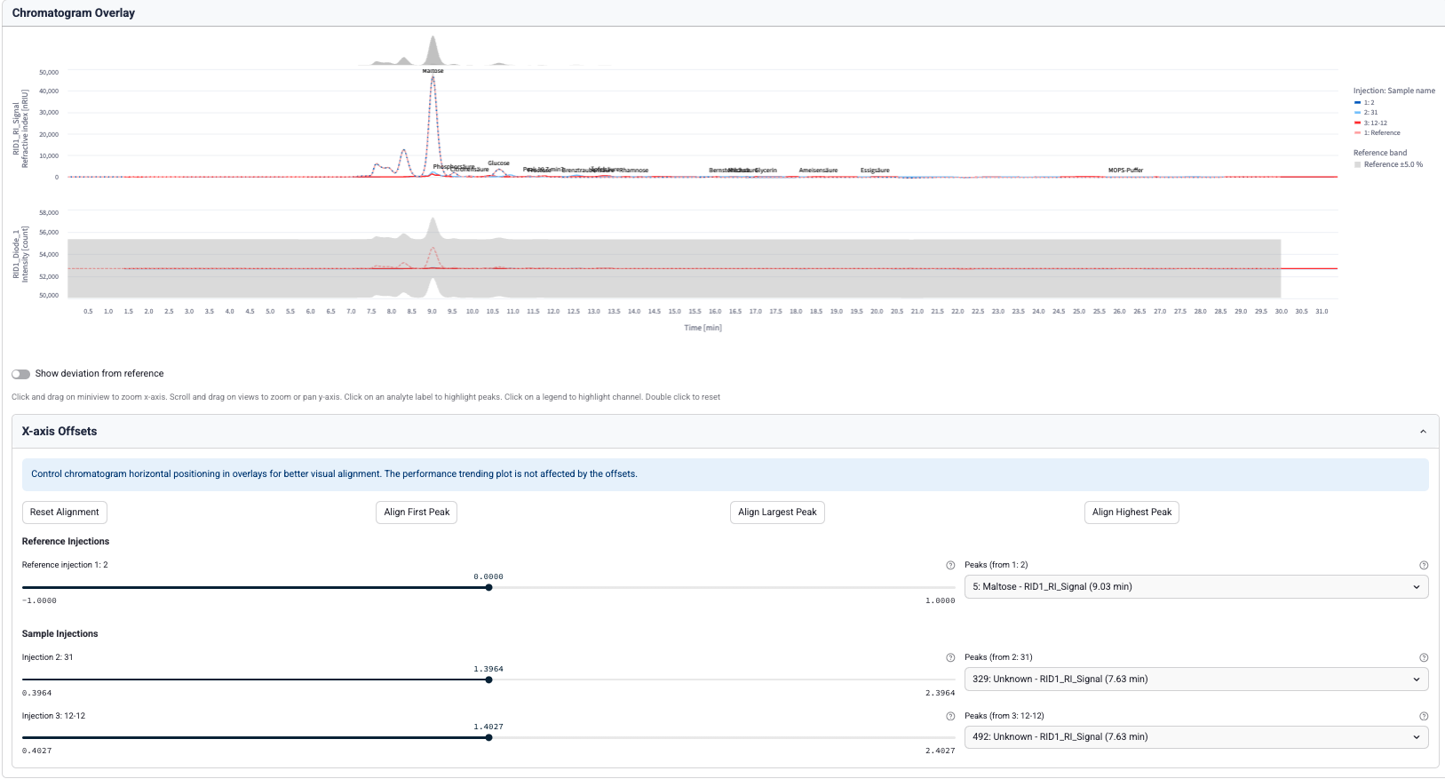 New dropdowns were also added for manual peak selection and to align chromatogram traces on any peak of interest. In the absence of a reference injection selection, all chromatograms will be aligned at their selected peaks.