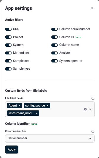 Scientists can now filter injections by using Custom fields from file labels as filters in the app's settings.