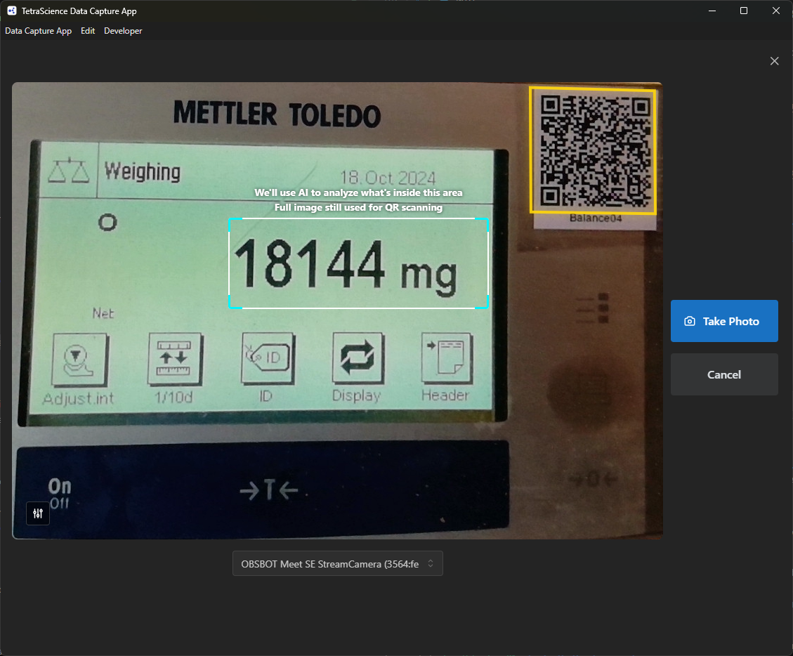 - Select the camera to use such that the rectangle is over the desired reading and the QR code is visible in the frame. Yellow borders around the QR code indicate that it has been detected.