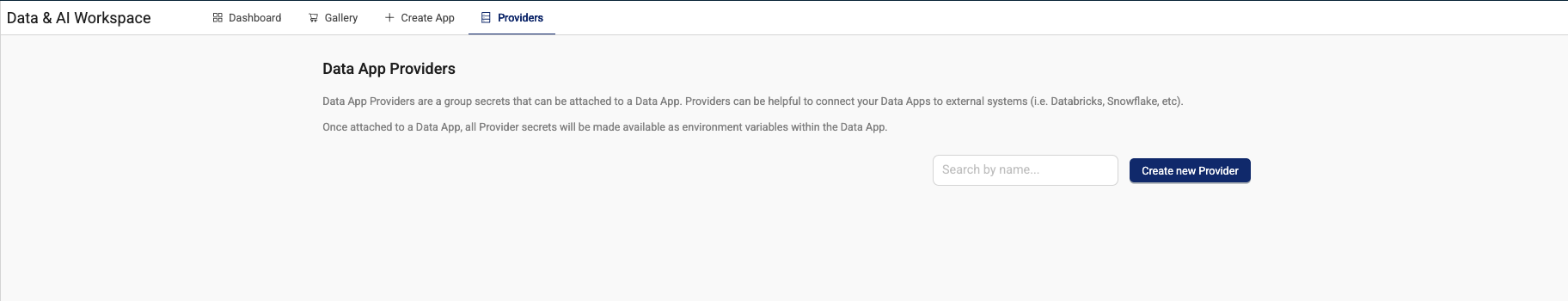To connect an Embedded Data App to an external system, such as Databricks or Snowflake, first create a new Data App Provider on the Providers tab. Then, add the provider to the Data App in the Tetra Data & AI Workspace.