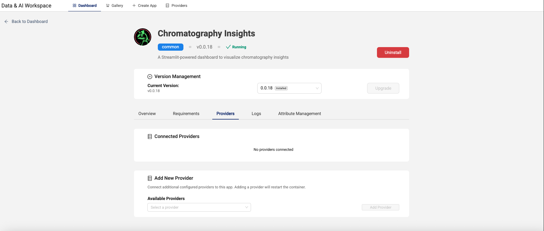 - Choose Uninstall to confirm. The Data App tile is removed from the EMBEDDED DATA APPS section of your Data & AI Workspace Dashboard and is no longer accessible to organization members.
