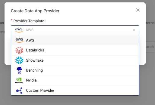 - In the Provider Template field, either select one of the preconfigured provider templates (for example, Databricks, Snowflake, Benchling, or Nvidia) or select Custom Provider to configure another provider. Then, fill in all of the required secrets fields, which vary between each external system.