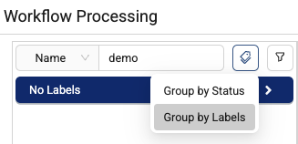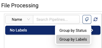 - To browse pipelines by either their status (Enabled or Disabled) or assigned labels, hover over the tag icon next to the Search field and select either Group by Status or Group by Labels. The pipelines in your organization appear in the list on the left, organized by either their status or assigned labels.