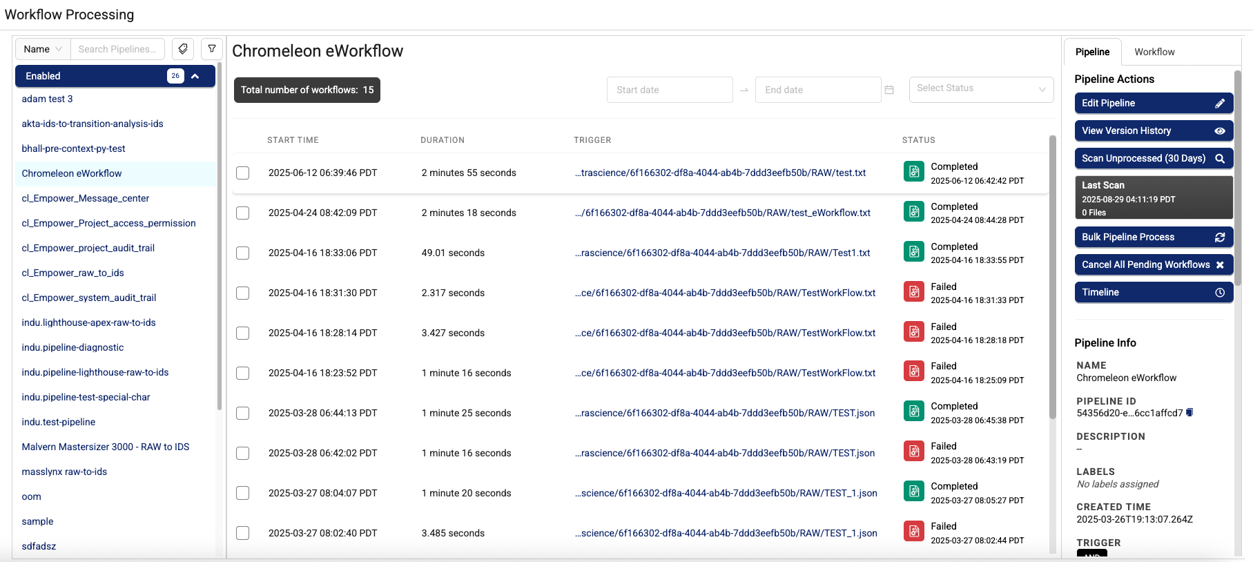 - In the Pipeline tab, you can click a link that will take you to a page where you can edit your pipeline, scan for unprocessed files, create a bulk pipeline process job, cancel pending workflow, and view high-level trigger, protocol, and step details.