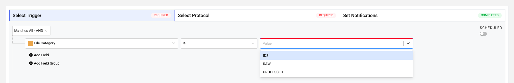 Select a trigger type from the left drop-down menu (the field is prepopulated with the File Category value). For more information about the available triggers, see Trigger Types.