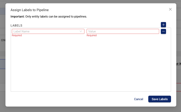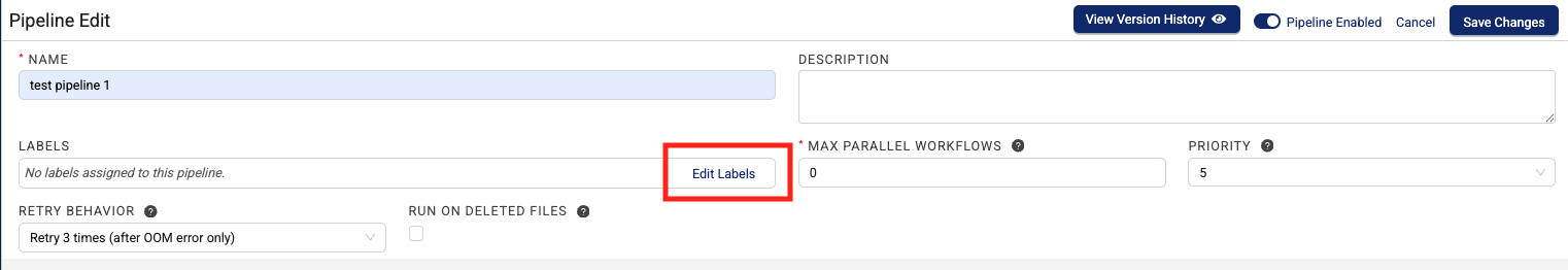 (Optional) For LABELS, assign labels to the pipeline to help with organization and access control.