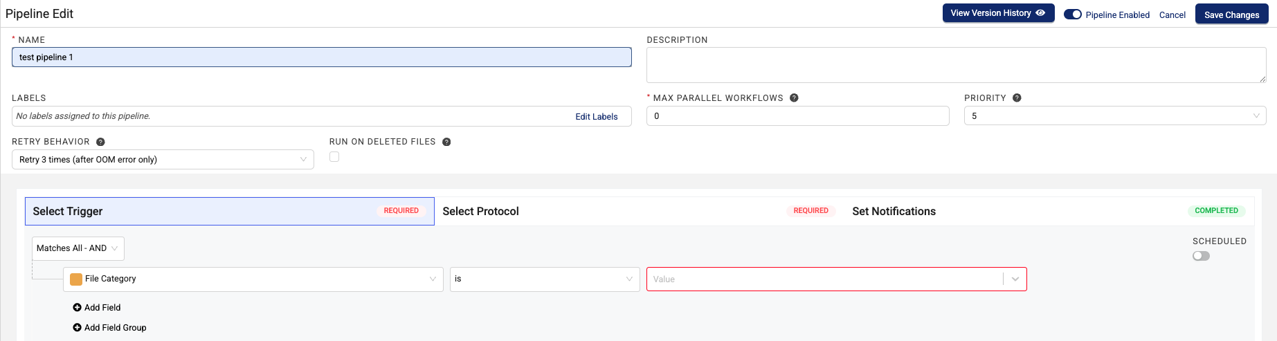 To create a scheduled trigger, which runs the pipeline at a scheduled, recurring time, select the SCHEDULED check box. Then, enter a specific, recurring time for the pipeline to run on and continue to Step 4: Select a Protocol. The minimum time interval is a