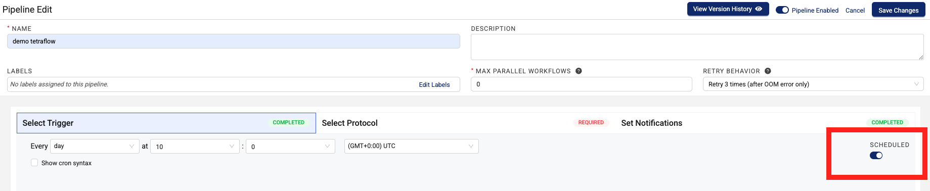 NOTETetraflow pipelines require scheduled trigger conditions.