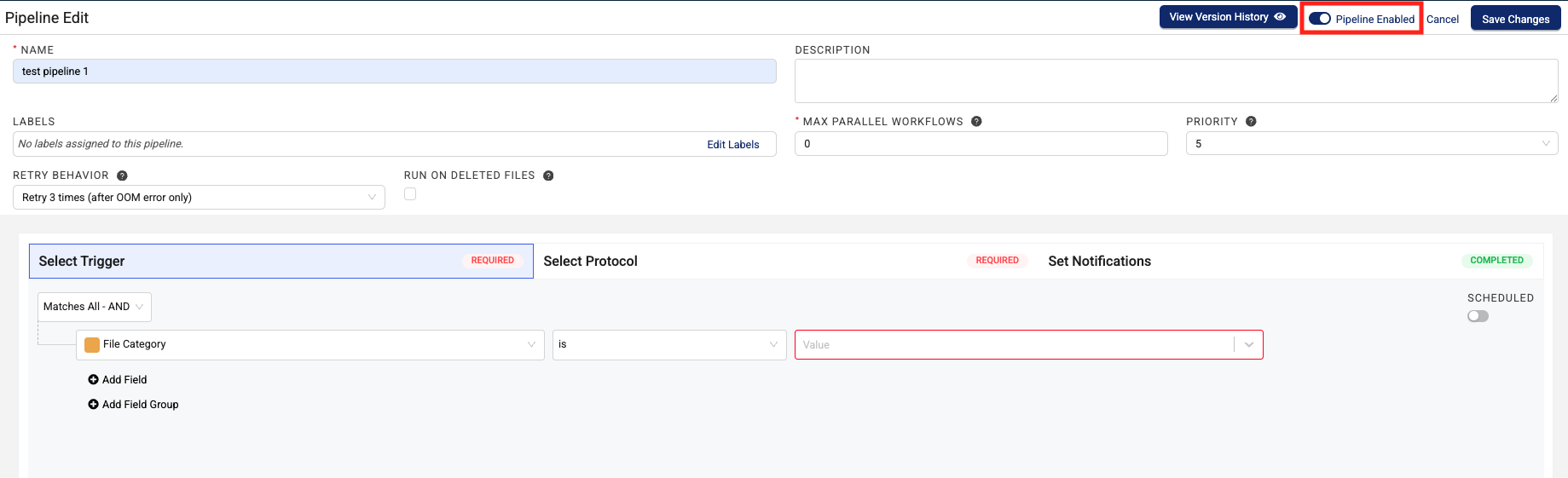 If you want the pipeline to be available for processing files, select the upper right Pipeline Enabled check box. It appears blue when the pipeline is active.