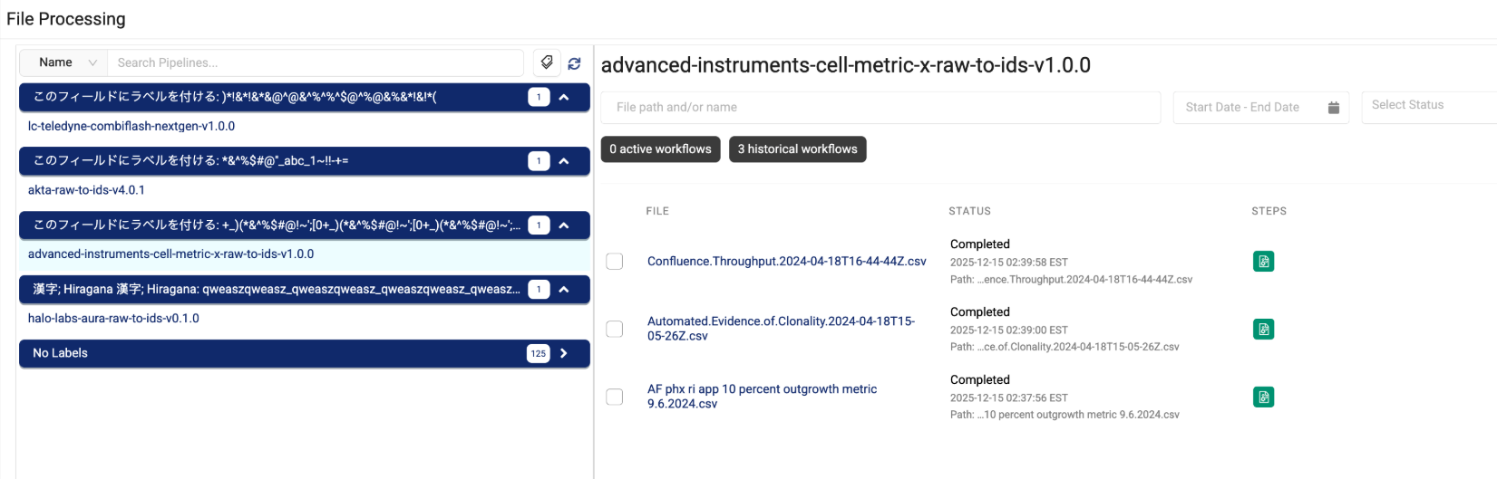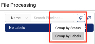 To provide improved organization and discoverability for Tetra Data Pipelines, the File Processing page now provides an option to group pipelines by their assigned labels, if there are any.