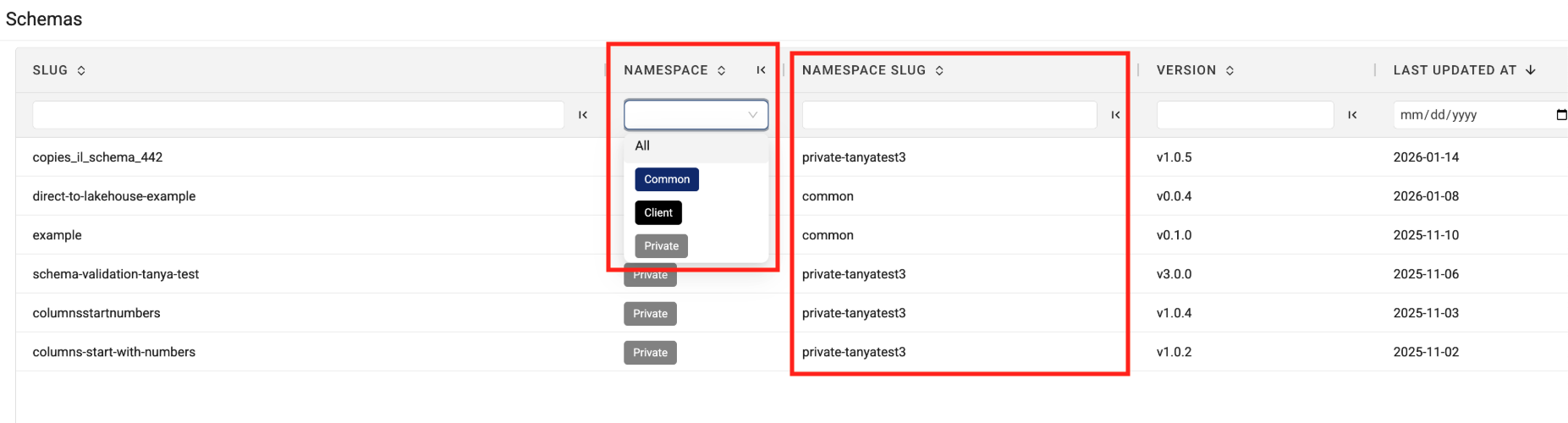 To help make it easier to quickly find and sort the new, limited availability Schema artifacts, the Schema page now displays each artifact's namespace and namespace slug.