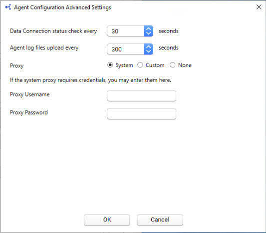 - (Optional) To reset the default settings for data connection status checks, Agent log file uploads, and proxy, select Advanced Settings. The Agent Configuration Advanced Settings dialog appears. In the dialog, you can edit the following settings: