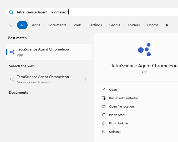 - The TetraScience folder is added to the Windows Start Menu, which includes the TetraScience Agent Chromeleon application.
