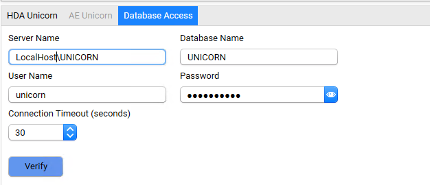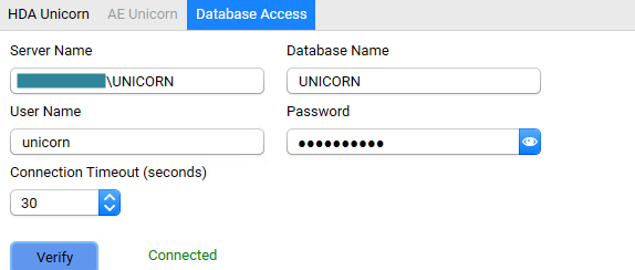 - For Database Server, enter the SQL Server hostname or IP address of the UNICORN database server.