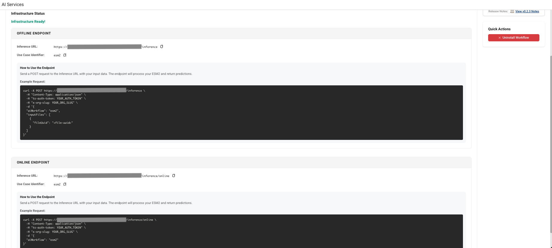 1. Copy either the OFFLINE ENDPOINT or the ONLINE ENDPOINT, based on the type of inference you want to run. You can then send a POST request to the inference URL with your input data, and the endpoint will process it and return a response. For more information about how to run an inference using your installed AI workflow, see Run an Inference.