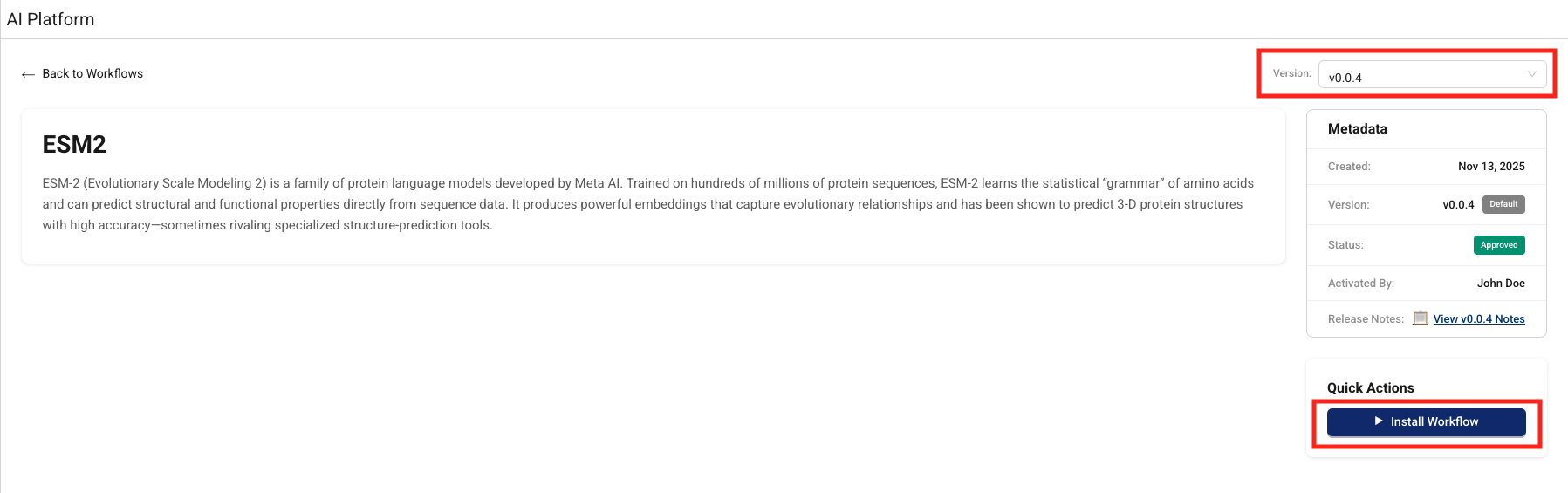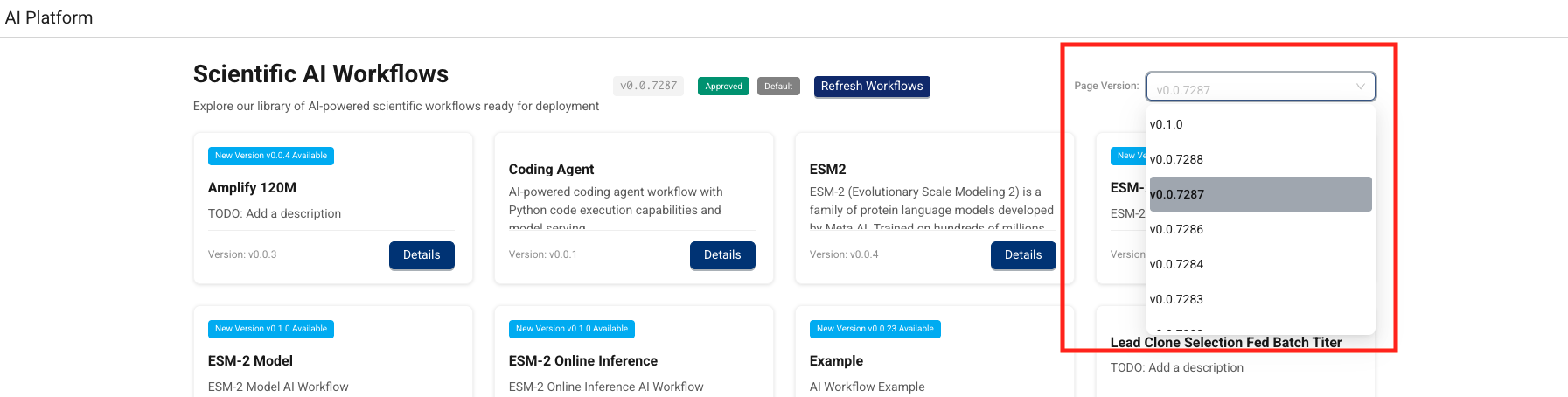 To browse Scientific AI Workflows by version and metadata, do the following: