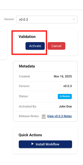To activate a specific AI workflow version and make it available to authorized users in your organization, do the following: