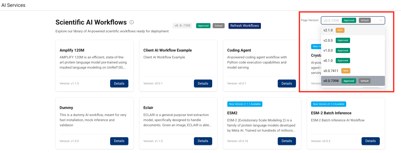 - Find a Scientific AI Workflow for your use case: Browse and review workflow versions with associated metadata.