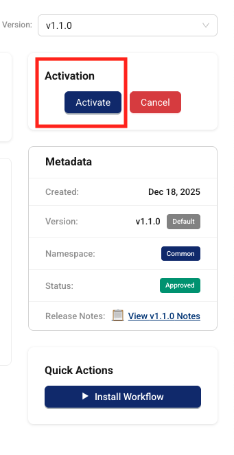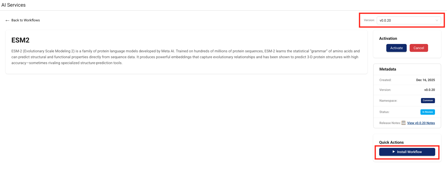 - Activate a Scientific AI Workflow: Admins can activate a specific workflow version to make it available for authorized users.