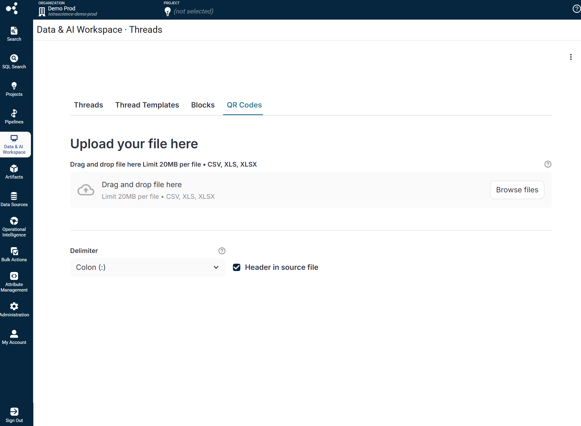 The QR Codes tab allows you to generate QR codes in bulk from uploaded CSV or Excel files. These QR codes can be used to identify instruments during data capture.