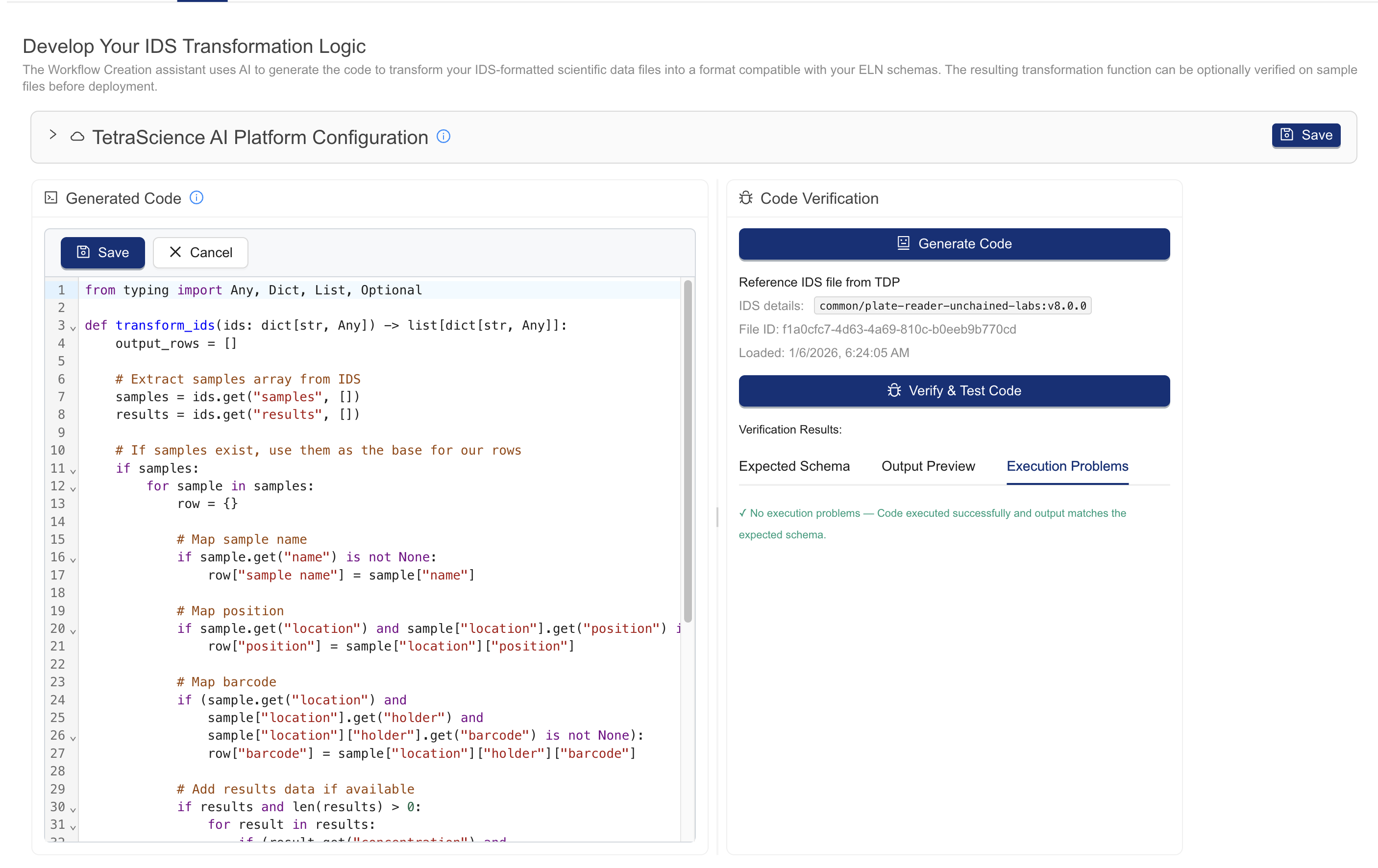 The TDP tab provides the ability to build and review the AI-generated Tetra Data Pipeline code for the data integration. While the Develop tab code extracts and transforms the IDS content into a suitable format for the target ELN, the TDP tab code loads the IDS from the Data Lake, transforms it, and pushes the data to the selected ELN.