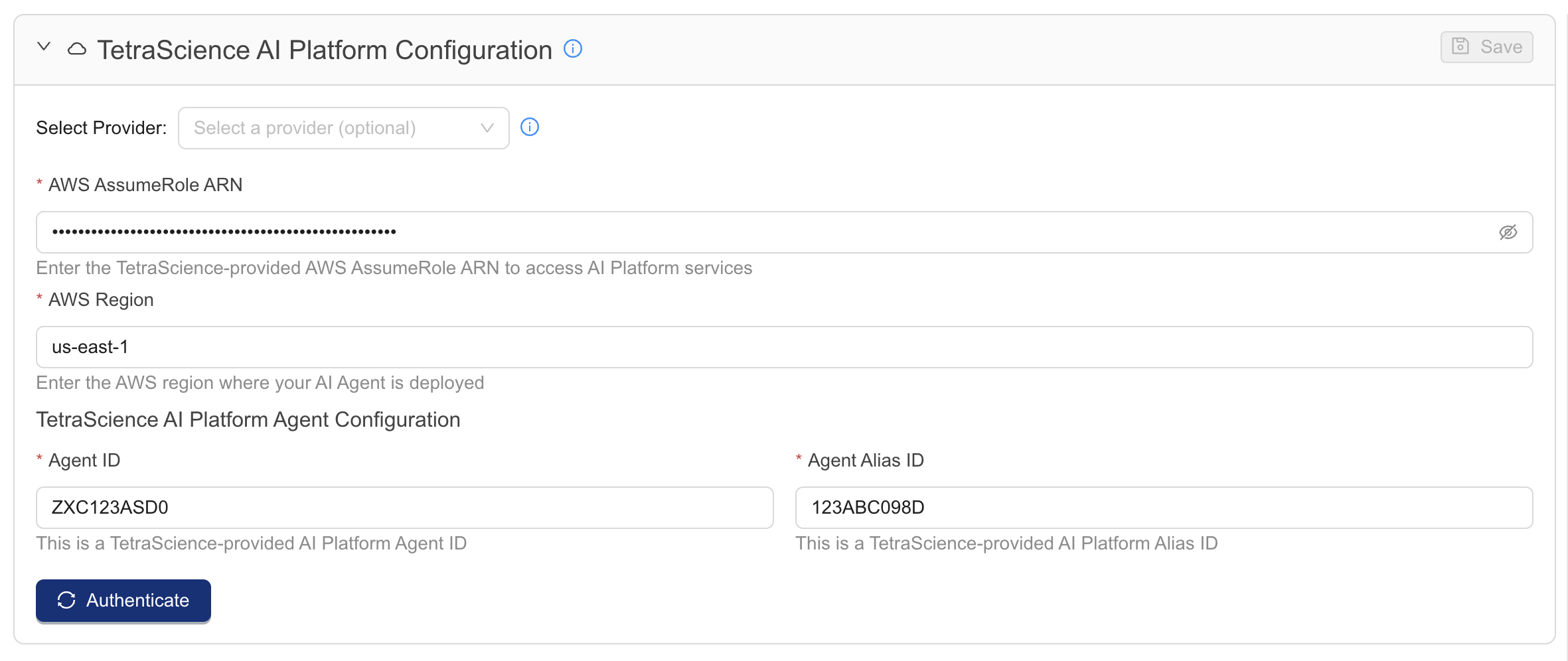 In the TetraScience AI Platform Configuration section, verify the following AWS configuration details (request AWS credentials from your customer account leader if they are not already configured):