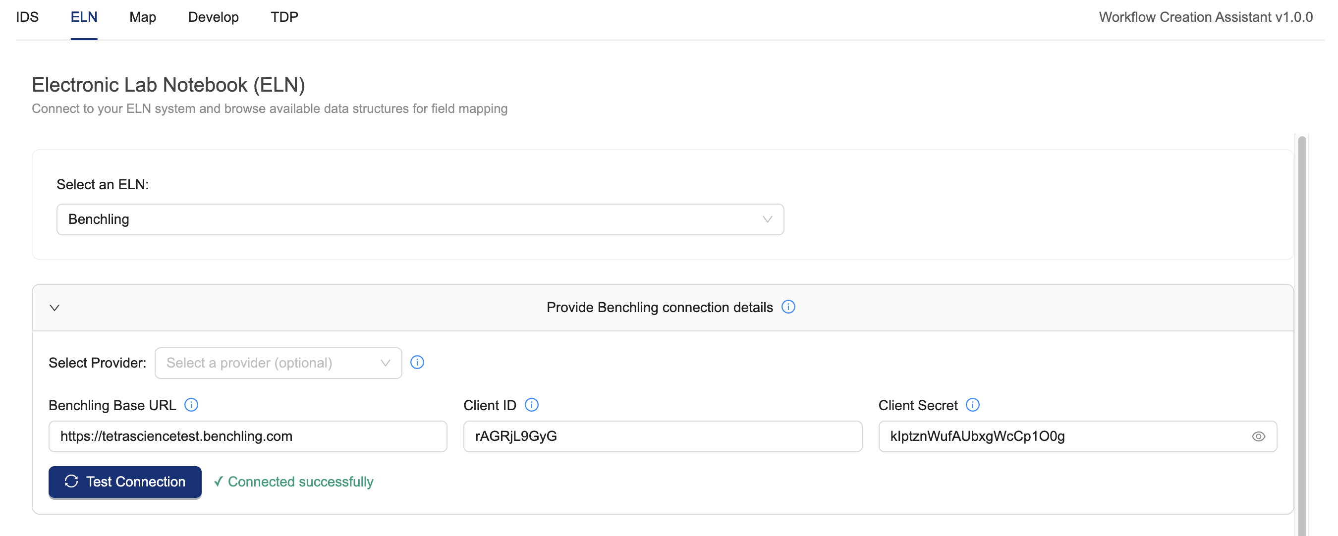 Due to the importance of live data for design and testing, users are strongly recommended to configure a reference IDS. Without the reference IDS, the Workflow Creation Assistant is unable to perform integration and end-to-end tests directly with the TDP.