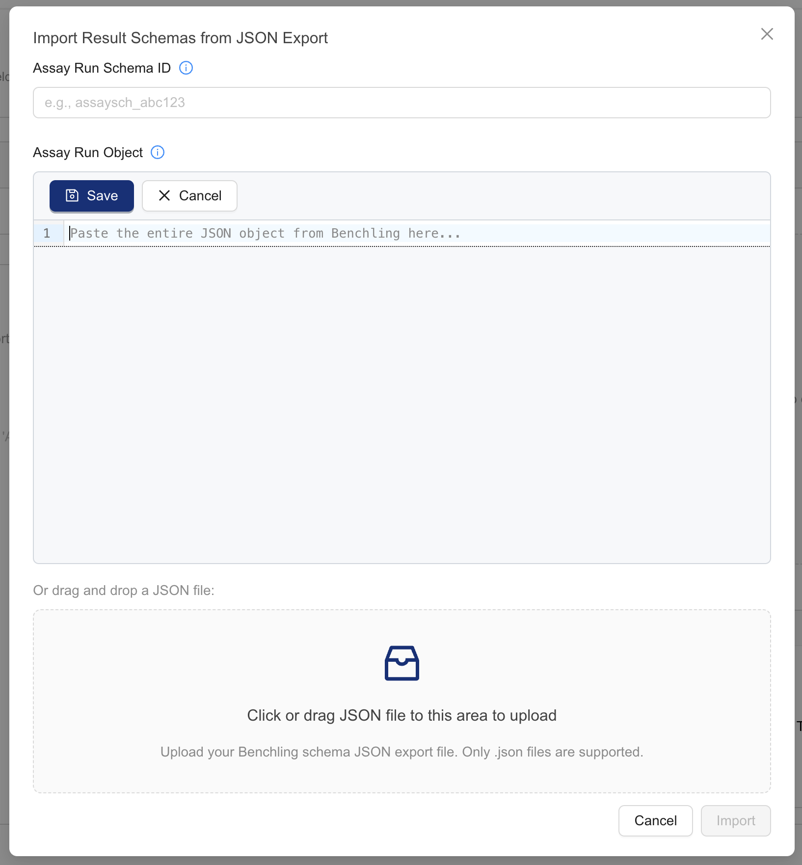 - For AssayRun object, enter your AssayRun object JSON code. You can copy this code from the Assay Run details page in Benchling Settings > AUTOMATION SCHEMAS > Run schemas > [select your AssayRun] > scroll to the bottom of the page and press the Edit as JSON button. Make sure that you copy the entire JSON object from Benchling to clipboard or as a file onto your computer. The file may be copied and saved in the web editor or uploaded as a file from your computer.