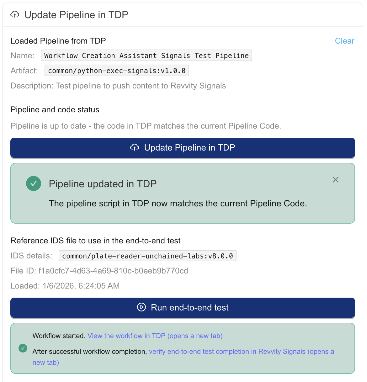 - Test the pipeline on the reference IDS. Press the [Run end-to-end test] button to process the reference IDS with the pipeline. This initiates the workflow. A message will appear with convenience links to verify test completion.