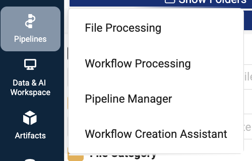 - In the left navigation menu, choose Pipelines. Then, select Workflow Creation Assistant.