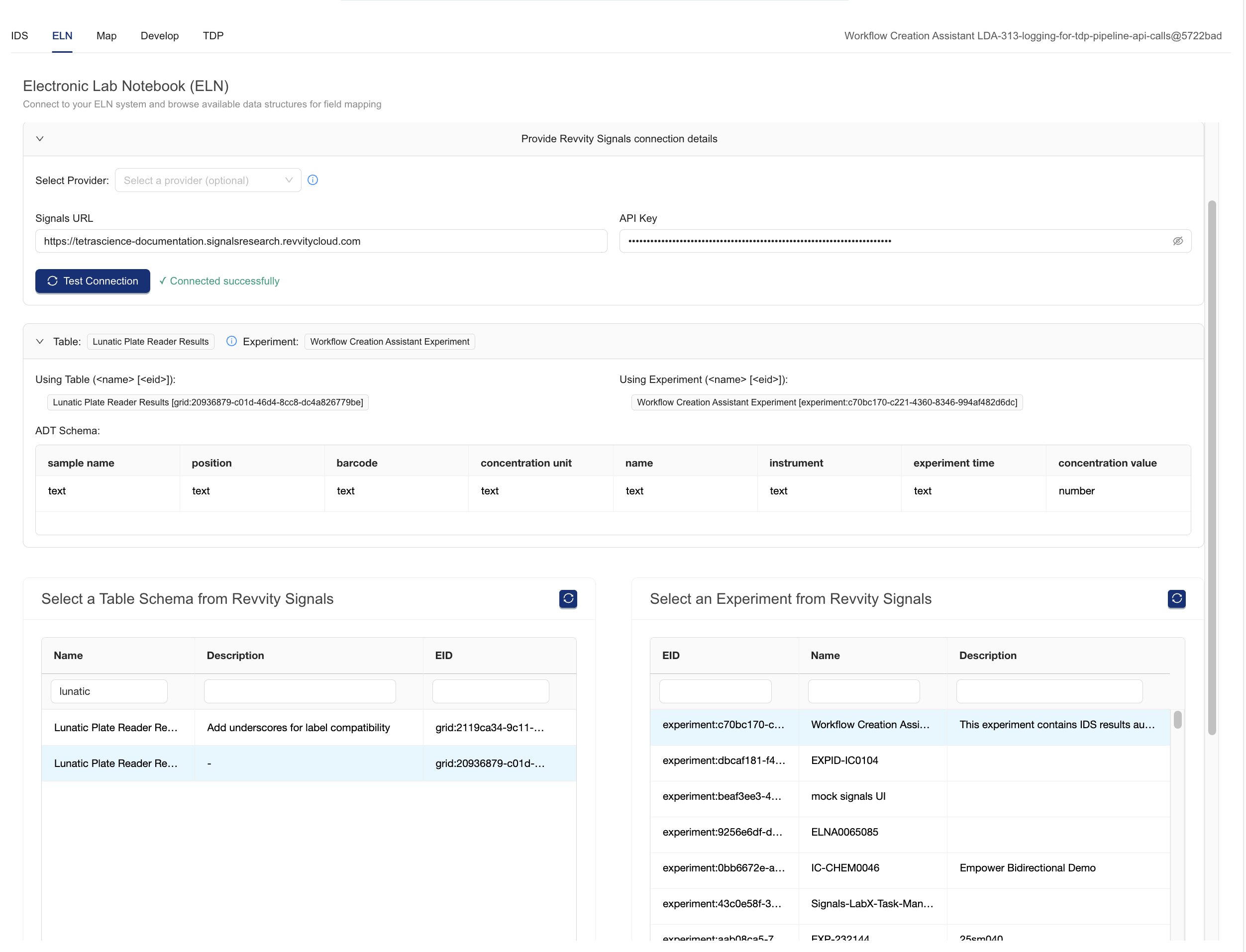 Press the Test Connection button. This will fetch content from Signals and populate the tables and experiments selectors at the bottom of the page.